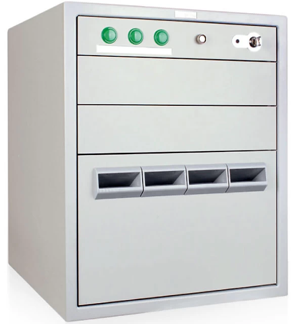 Нижний ящик снабжен 4-х секционной кассетой для хранения депонируемых банкнот раздельно по номиналам. Вместимость одной секции до 1500 купюр (в пачках)