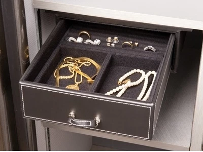 На двери изнутри располагаются удобные рамки для пистолетов и ножей, карманы и закрывающиеся сумки. В комплект входит выдвижной ящик для драгоценностей, а также – два специальных пакета COOL POCKET™ для документов особой важности; пакеты изготовлены из материалов с высокой огнестойкостью, что позволяет обеспечить дополнительную защиту при пожаре.